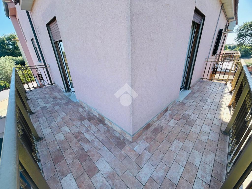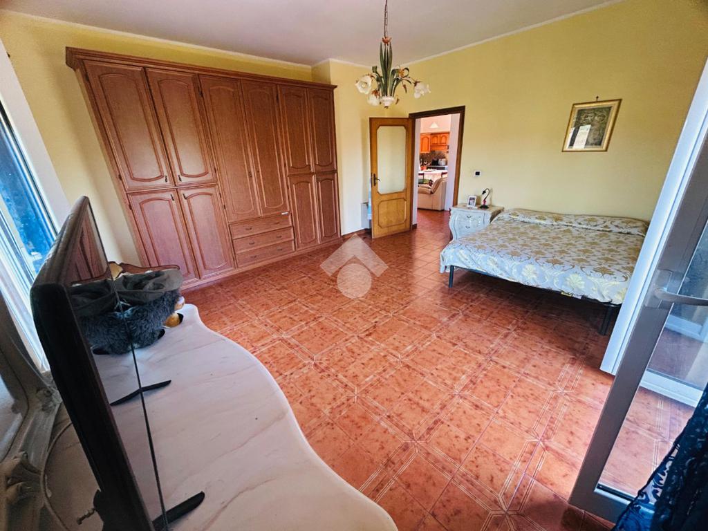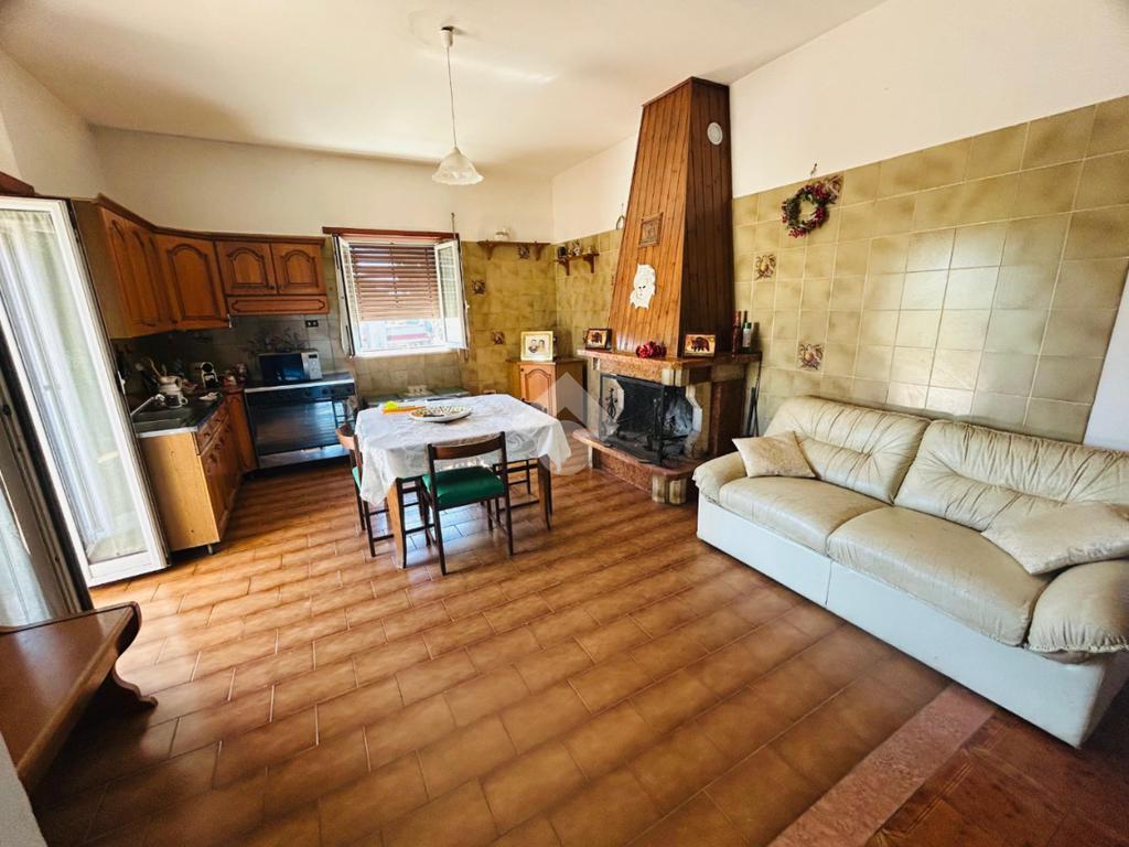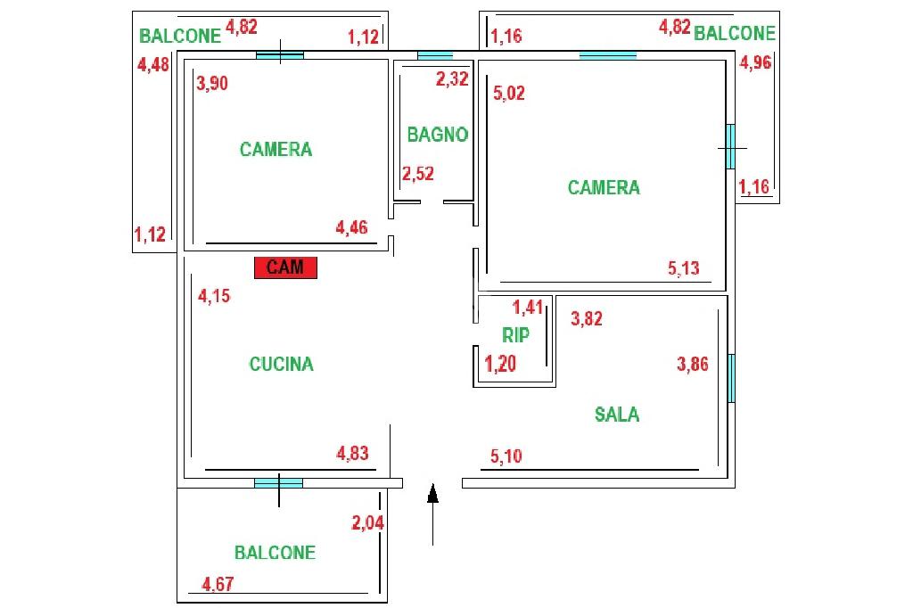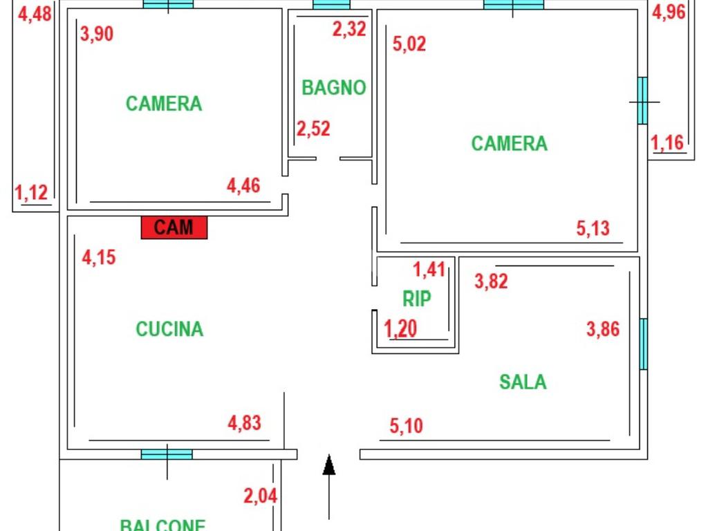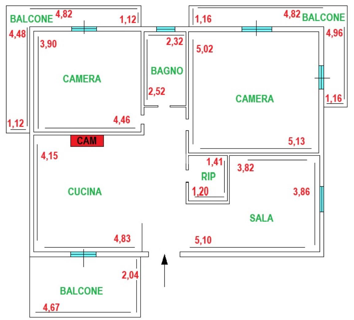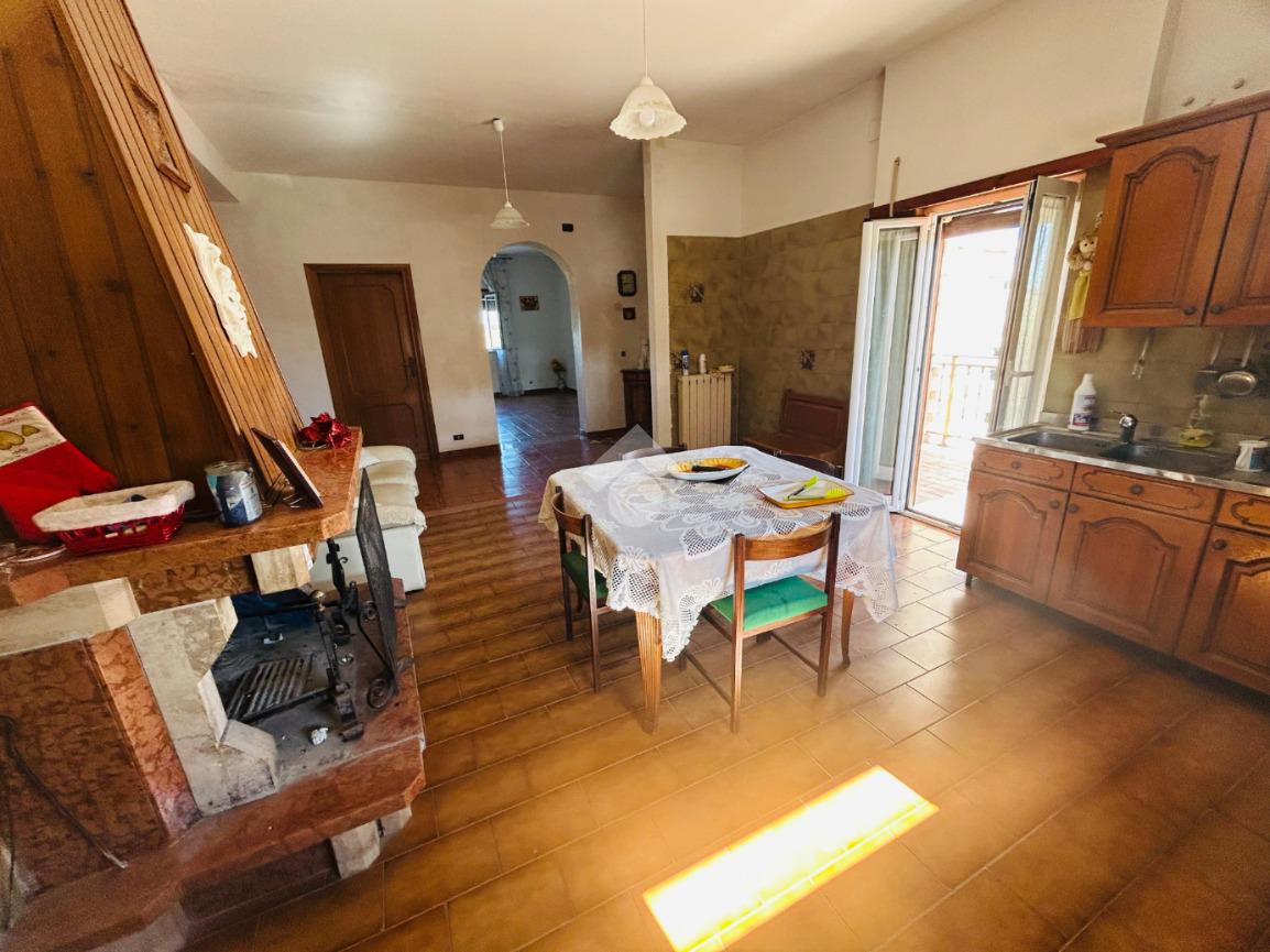 Ingresso, sala, cucina di 20 mq con camino e balcone abitabile, 2 camere da letto matrimoniali servite da 2 balconi, bagno con doccia e ripostiglio.