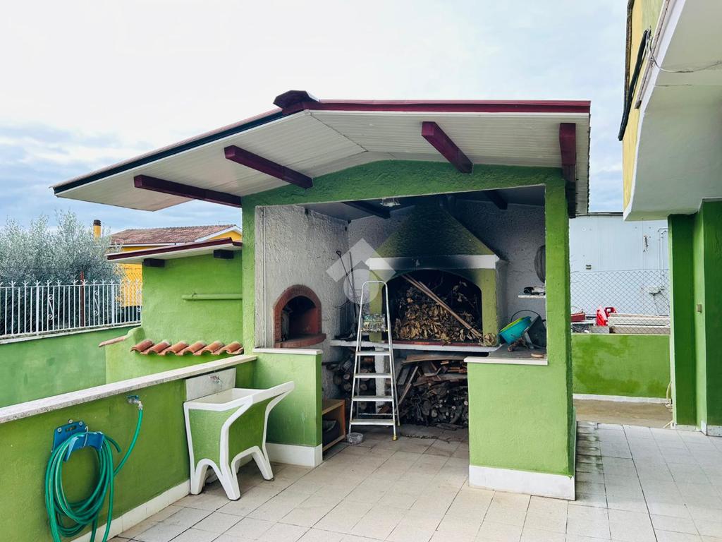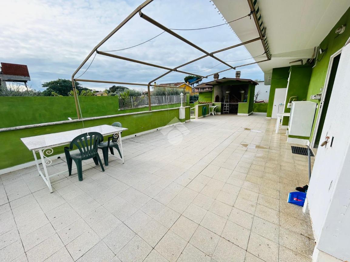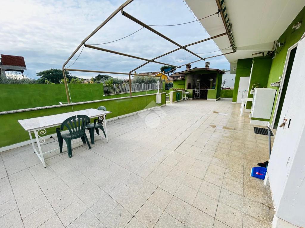 Terrazzo di 83 mq con accesso diretto dalla cucina con forno in muratura.