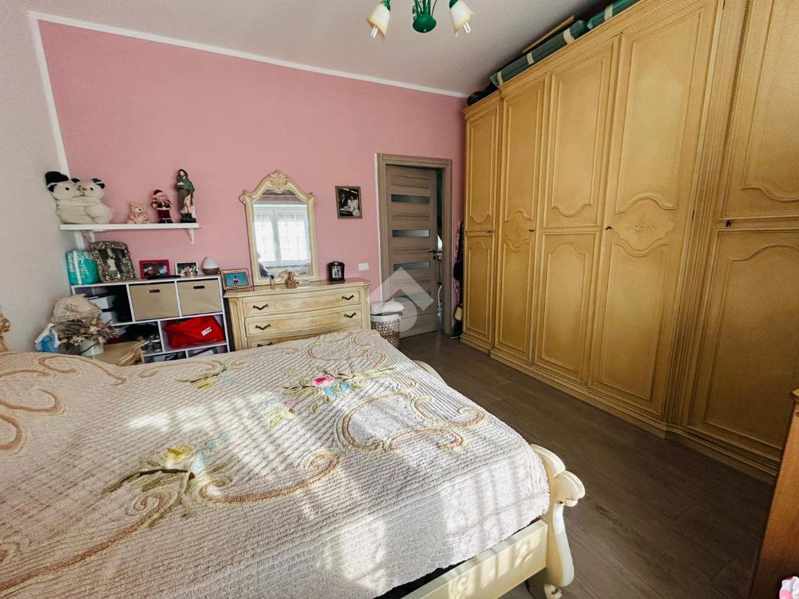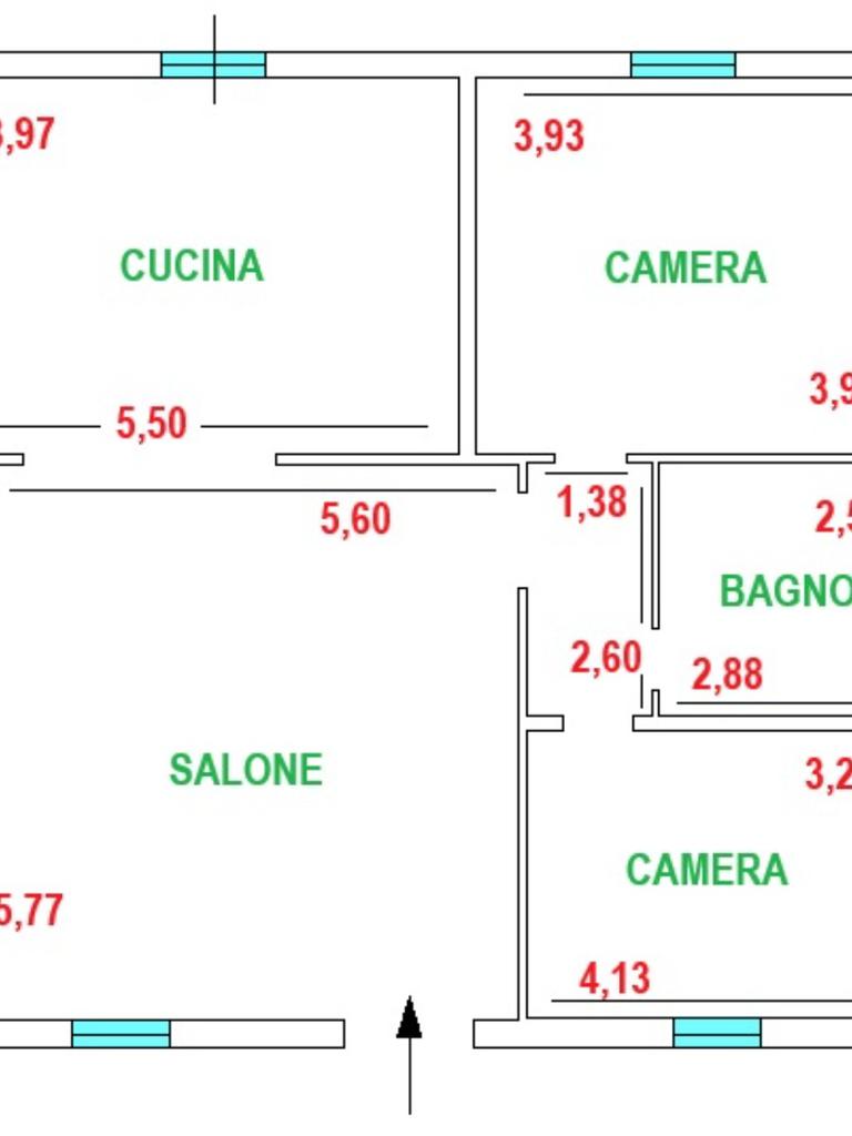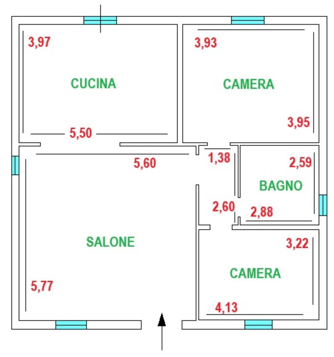 Salone con cucina abitabile a vista per totali 55 mq, 2 camere da letto ed un bagno.