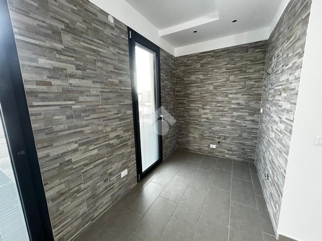 Terrazzo di ingresso di 18 mq dotato di pergotenda elettrica con led, ripostigli esterni contenenti attacco della lavatrice, pompa di calore e batteria di accumulo del pannello fotovoltaico da 1kv.