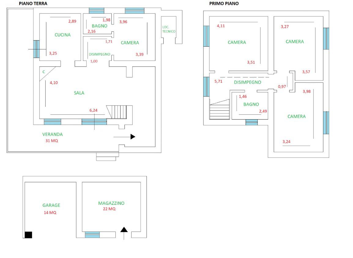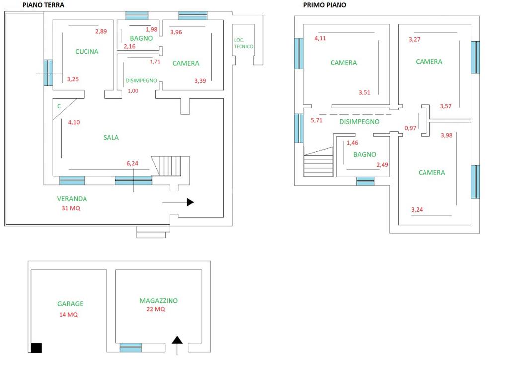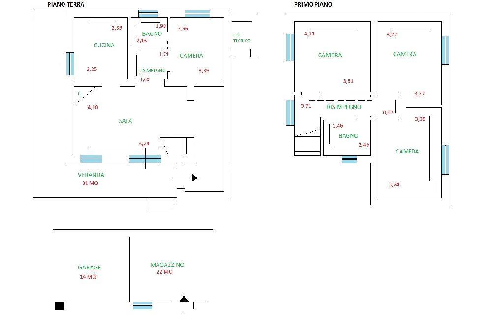 Al piano terra ingresso sulla veranda di 31 mq, sala con termocamino utile per il riscaldamento generale, cucina separata in muratura, una camera da letto e bagno con doccia.