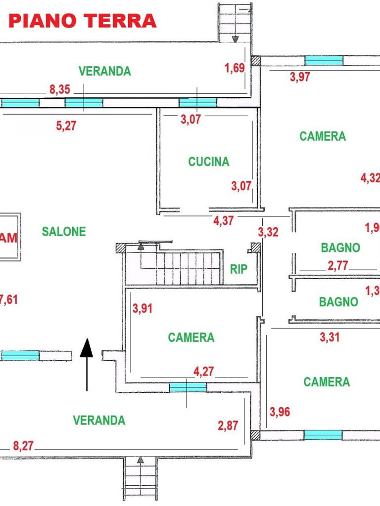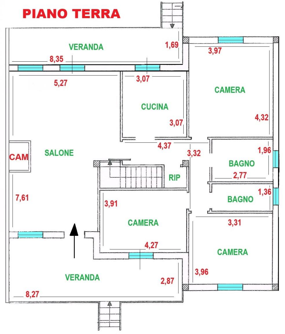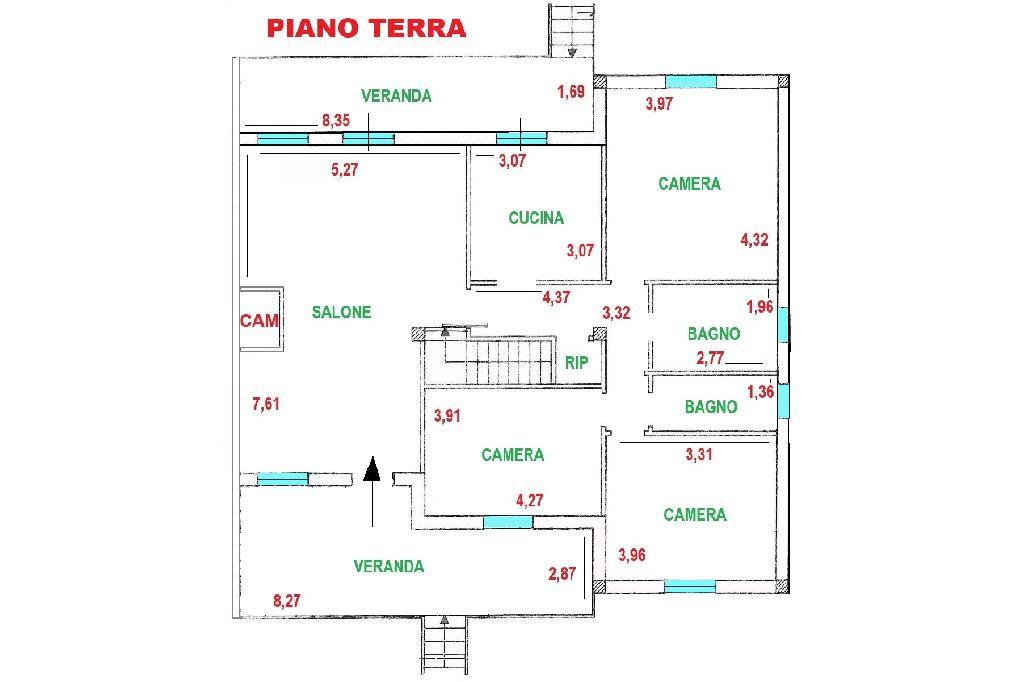 Al piano rialzato: salone con camino, cucina abitabile, 3 camere da letto, 2 bagni con finestra, ripostiglio e 2 verande a livello.